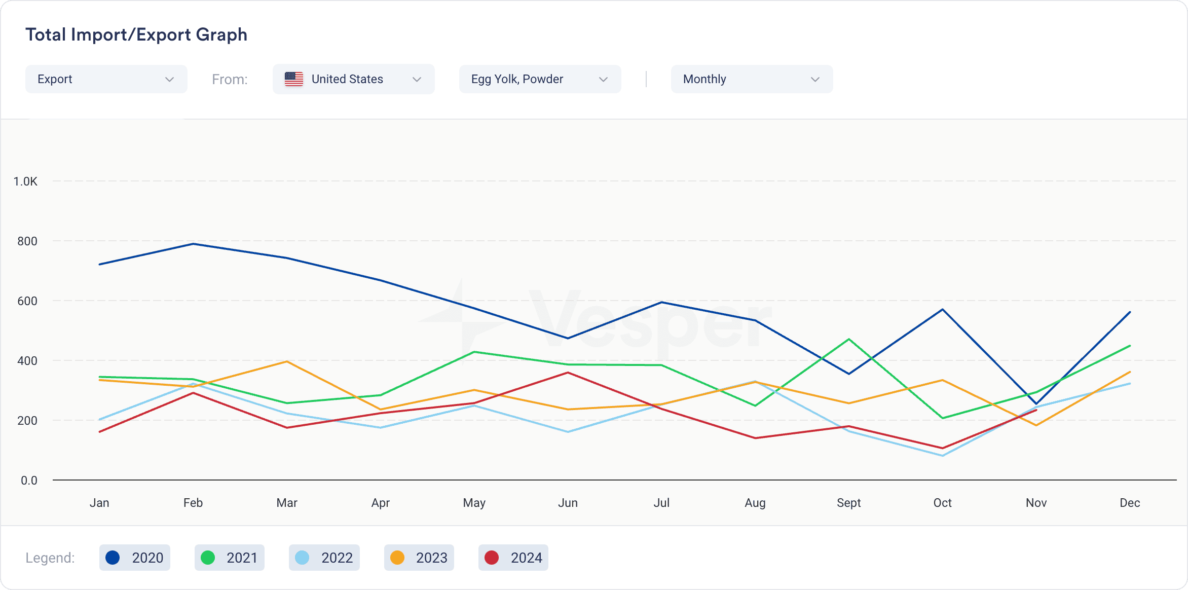 With the addition of egg prices to the Vesper Price Index, alongside in-depth market analyses, AI-powered news updates, and detailed import/export data, Vesper has solidified itself as the go-to platform for comprehensive egg market intelligence. Whether you are a buyer, producer or trader, our platform equips you with the insights needed to navigate market volatility and enhance your negotiation power.