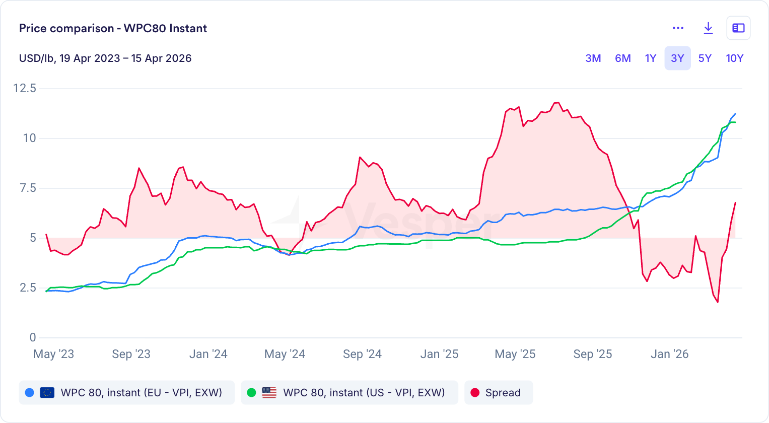 The protein market had already been running hot for years before GLP-1s entered the picture, but adoption took it somewhere genuinely new. In one of our US Weekly editions last summer we flagged that a five-year view of the Vesper Price Index for high-protein whey would give buyers whiplash, with the VPI sitting roughly 3x above its five-year floor. In practical terms, a US buyer of WPC80 in mid-2025 was paying around three times what the same product would have cost during the softest point of the previous five-year window — and not as a momentary spike, but as a sustained working price that procurement teams had to build into their contracts and cost models.