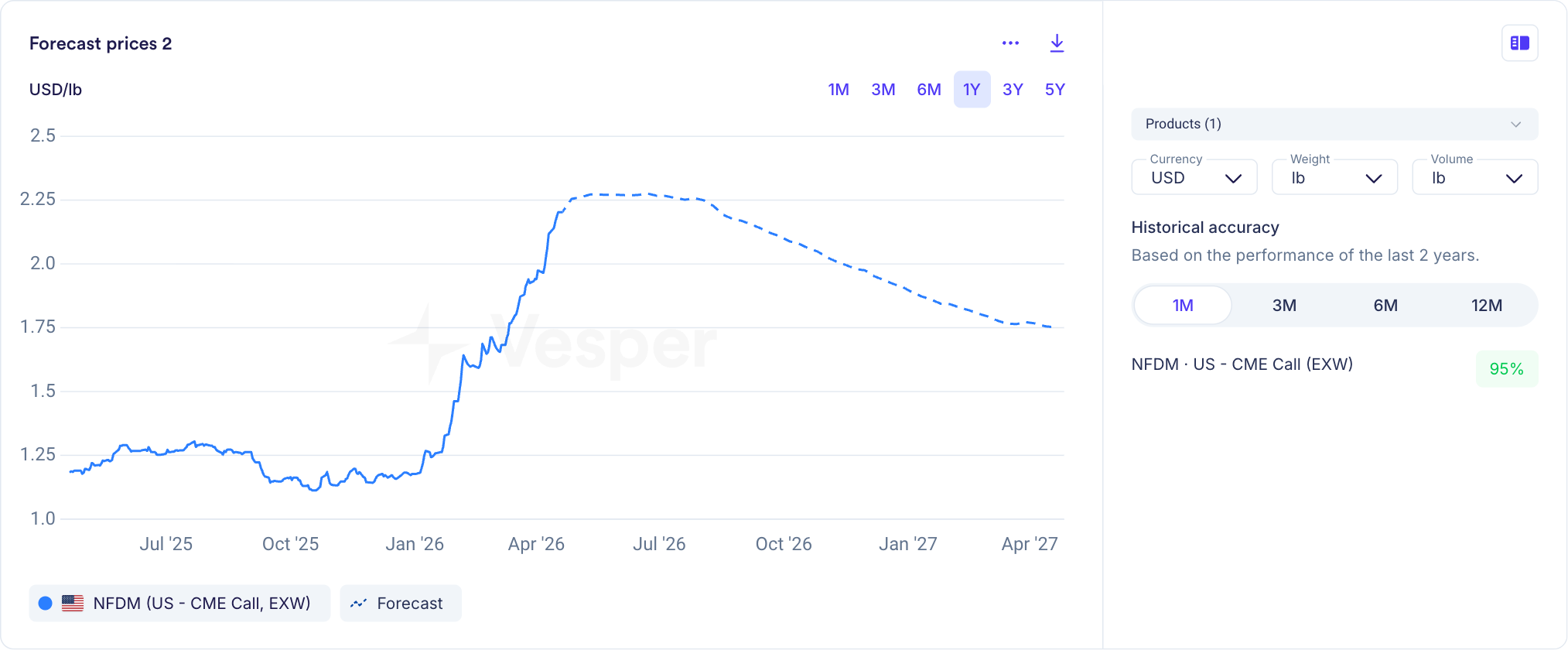 Take the CME call NFDM as a worked example. Measured over the last two years, the Vesper CME NFDM forecast has held 95% accuracy at one month and 88% at three months. NFDM is a commodity that moves on a combination of US milk production, cheese-versus-powder yield economics, export demand from Mexico and Southeast Asia, and macro signals like the dollar. Holding 95% accuracy at one month and 88% at three months on a series with that many moving parts is unusual, and it is why we point US dairy ingredient buyers to the NFDM forecast first when they ask how accurate our work really is.