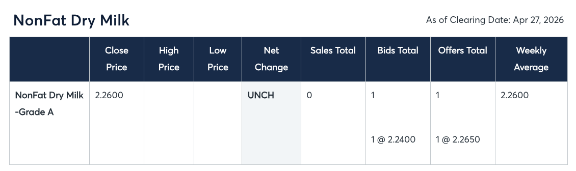 The CME spot call settles for cheese, butter, NFDM, and dry whey feed into the National Dairy Products Sales Report (NDPSR), the weekly USDA-published wholesale survey. The NDPSR feeds the formulas that calculate the monthly USDA-announced Class III and Class IV milk prices. So today’s CME call settles are an early signal for what the next monthly Class III and Class IV announcements will land at, even though those announcements are still weeks away.