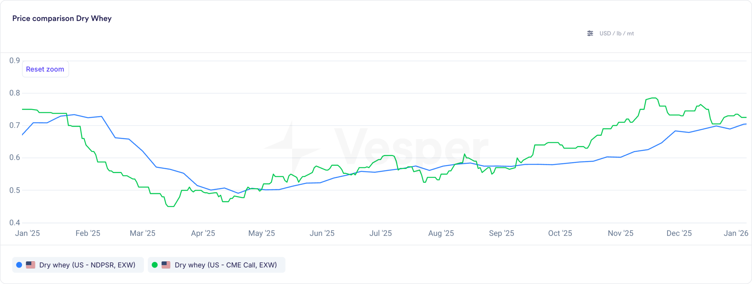 Whey proteins stayed anomalously strong in an otherwise weakening dairy complex. US dry whey prices held stable near year-ago levels while butter, cheese, and NFDM collapsed.