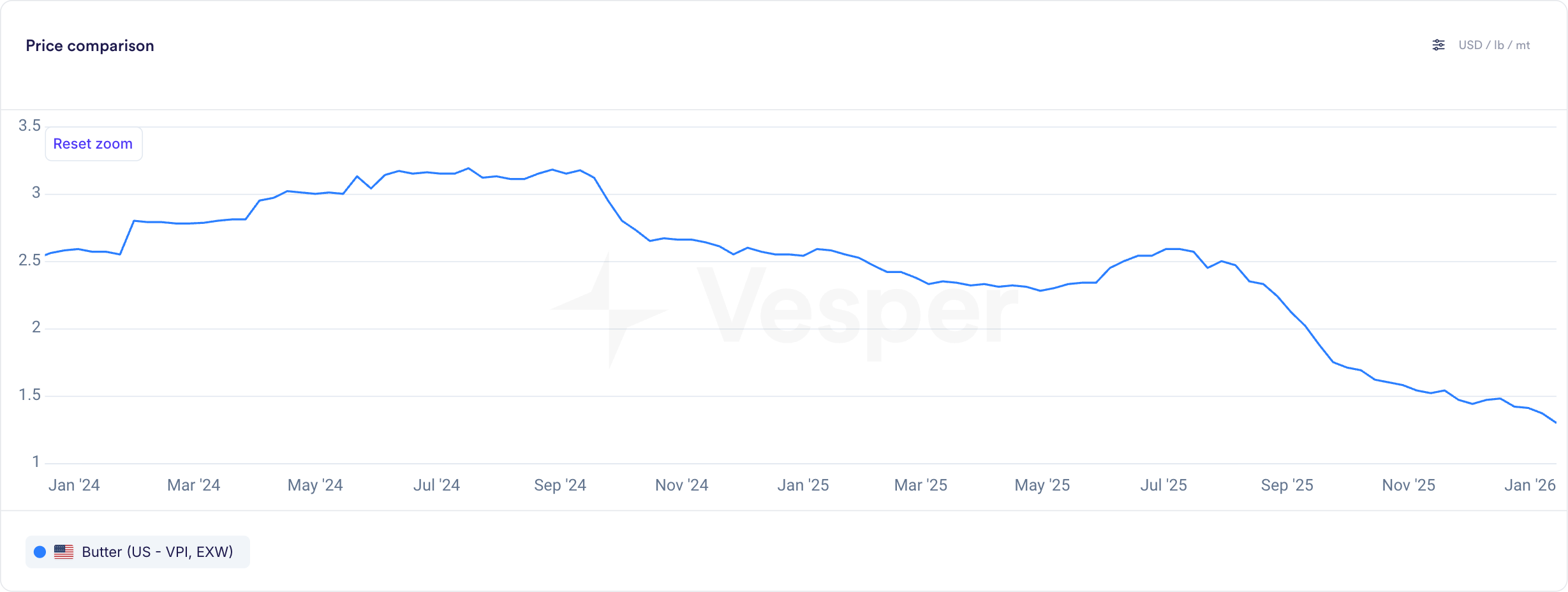 If you bought US butter at the start of 2025, you paid around $2.50 per pound. By December, that same butter cost $1.45.