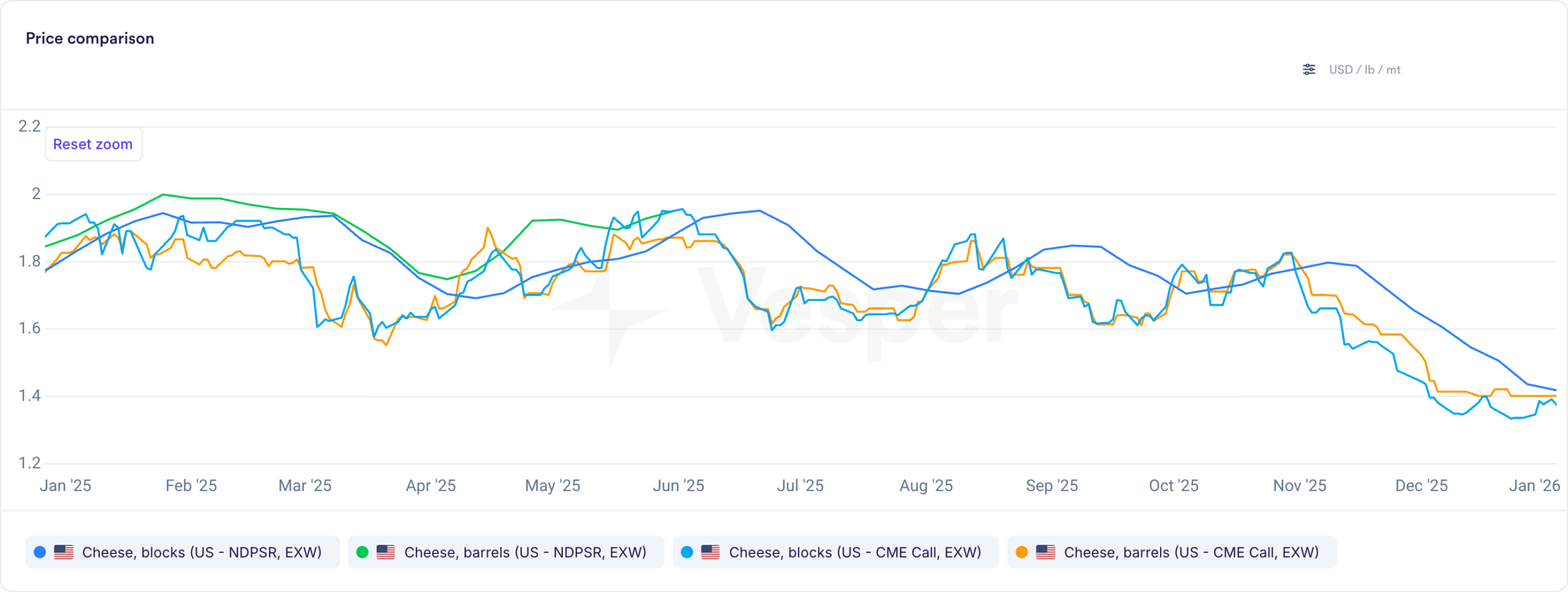 2025 was the year the US cheese industry hit a ceiling. New production facilities came online. Milk flowed in abundance. But domestic consumption stayed flat, and European price wars eroded the export advantage that had propped up margins for months. Prices fell 27% over the year, from nearly $2/lb to $1.47/lb.