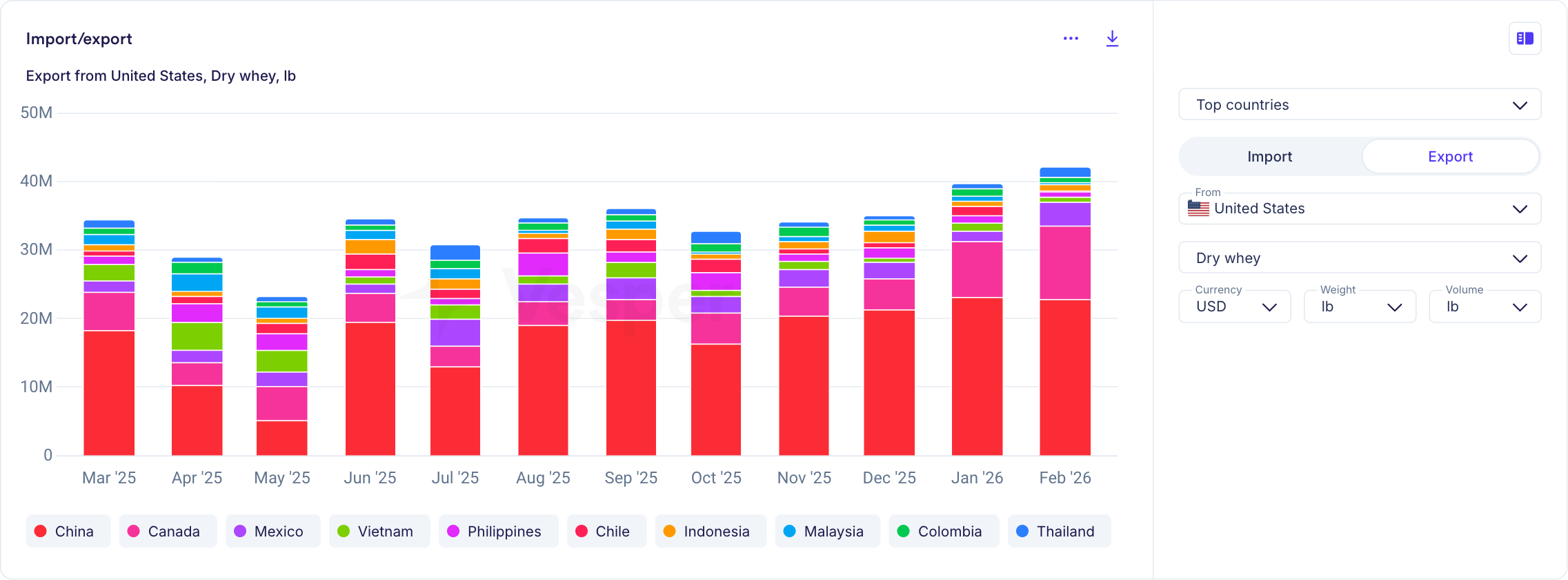 Dry whey had its export picture centered on one country: China, which consumes roughly 150 million pounds of the 400 million pounds of US dry whey exports annually and took 45% of China’s dry whey imports from the US. When China’s broader tariff escalation reached 84% on US products, exports plummeted 30% month-over-month. New trade lanes formed in Southeast Asia and Latin America, but as the US Weekly reported, those volumes “weren’t sufficient” to fill the China gap. Of the top 10 US whey export destinations, 7 had received tariff threat letters from the US government, meaning the trade relationships underpinning whey exports were under threat from multiple directions simultaneously.