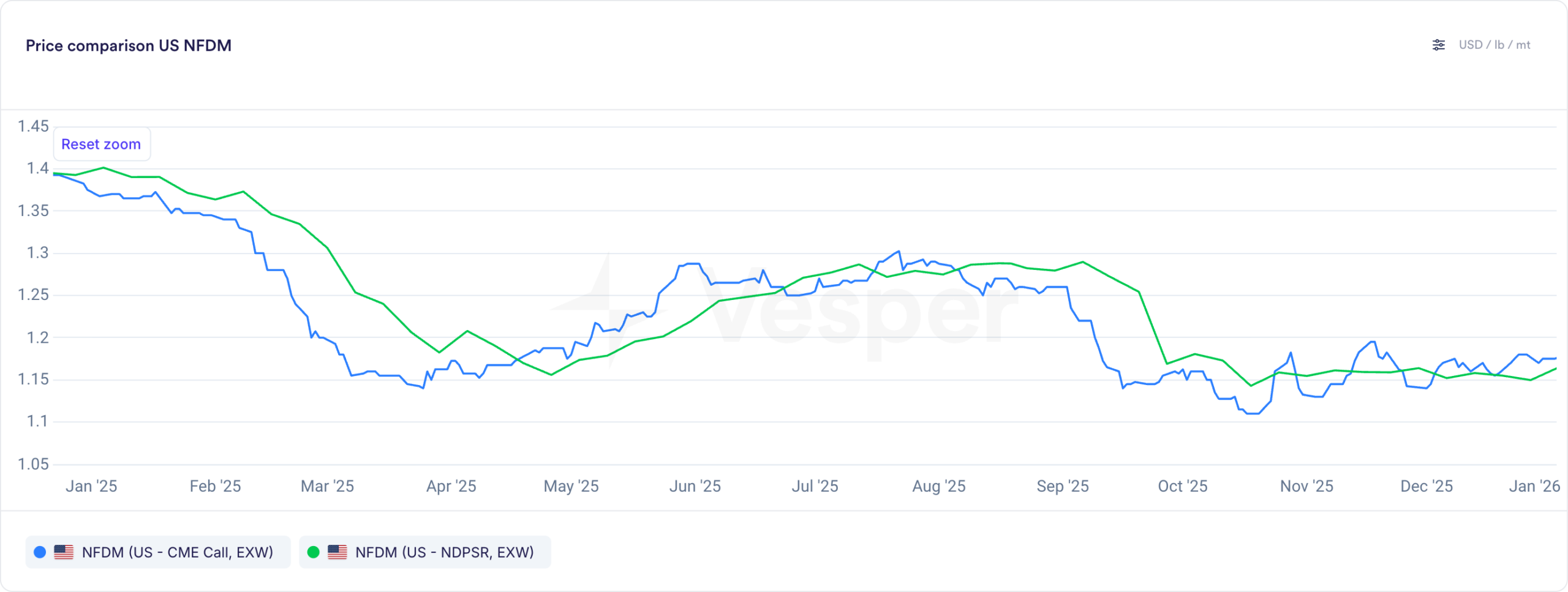 Pricing pressure from alternatives. EU SMP and NZ WMP set the global baseline. US NFDM couldn’t command a premium. In fact, it traded at a discount. That discount wasn’t enough to move volume because tariffs added a percentage cost on top of it.