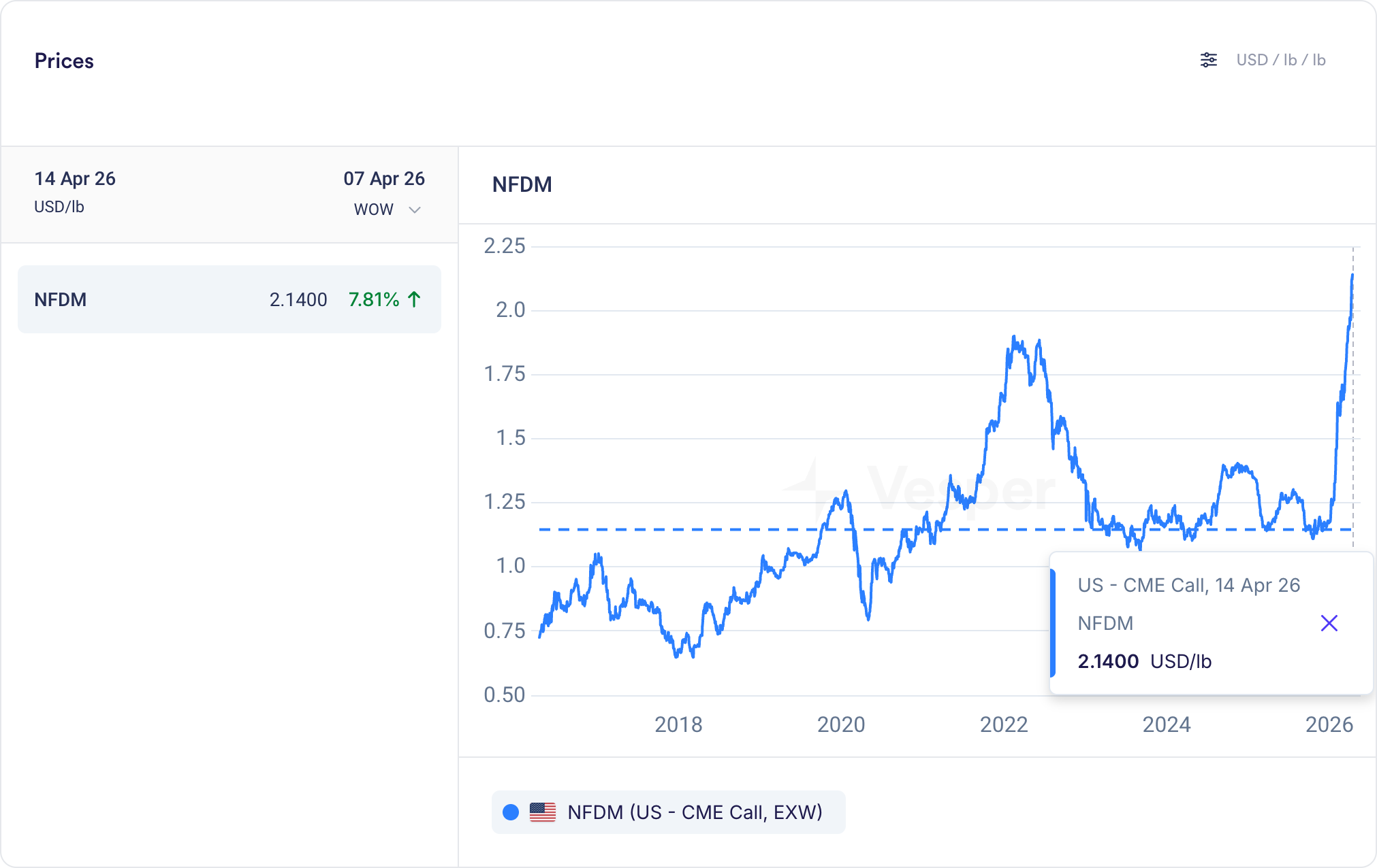 By mid-March, NFDM hit $1.765/lb, a 59% increase from Q4 2025. By late March it reached $1.9375/lb, the highest since 2014 and, for the first time, more expensive than butter. In the first week of April it touched $1.9725/lb before finally breaking through $2/lb by mid-April, short-squeezed above the line on the CME Call as supply ran very short and buyers were still caught on the wrong side of volumes they needed.