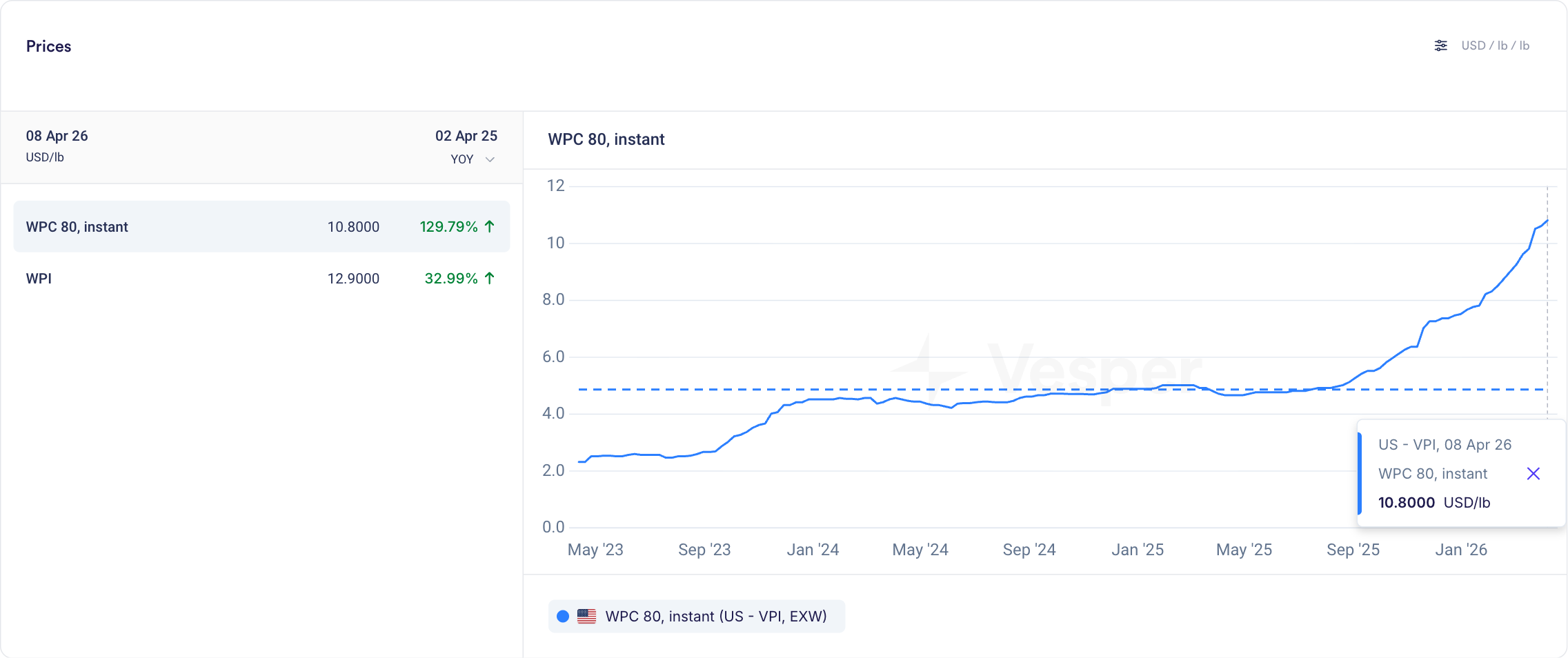 US WPC80, instant prices according to the Vesper Price Index in USD/lb