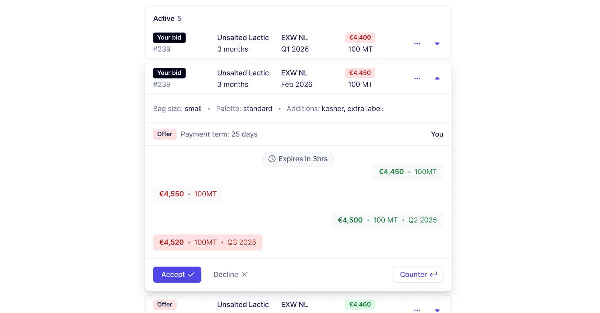 But email-based tendering limited their reach and slowed execution. When they tested Vesper Marketplace for three months, competitive bidding across a broader network revealed price spreads of up to 2–3% on identical butter specifications.