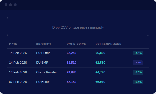 Once your data is in Vesper, it works as a live input. Feed it into cost models. Track how your prices move relative to the market over weeks, months, and quarters.