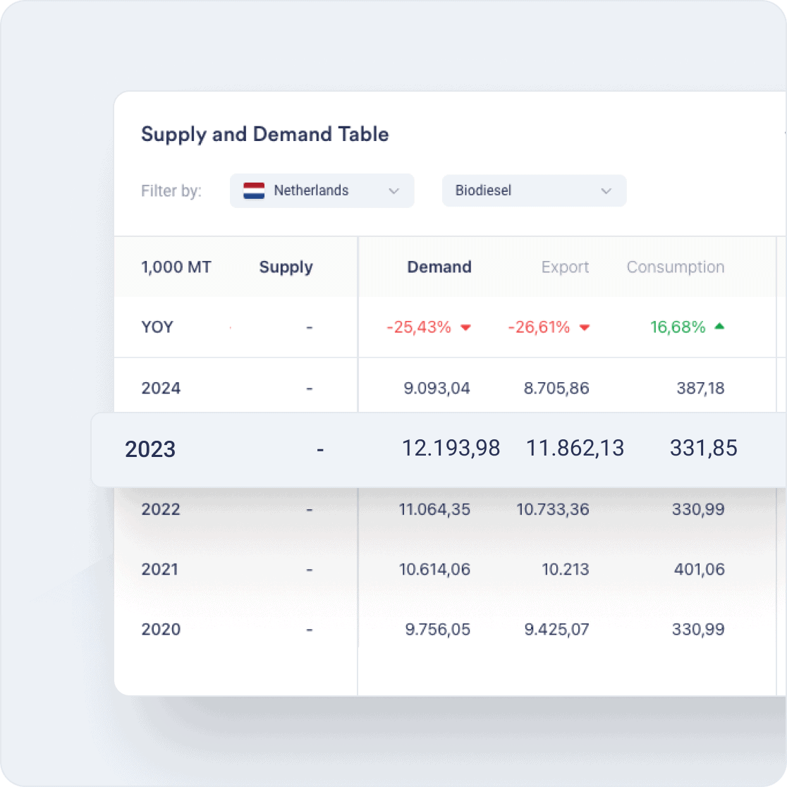 Gain a comprehensive market overview, combining key fundamental indicators such as Import/export data, consumption patterns, production levels, and stock levels.