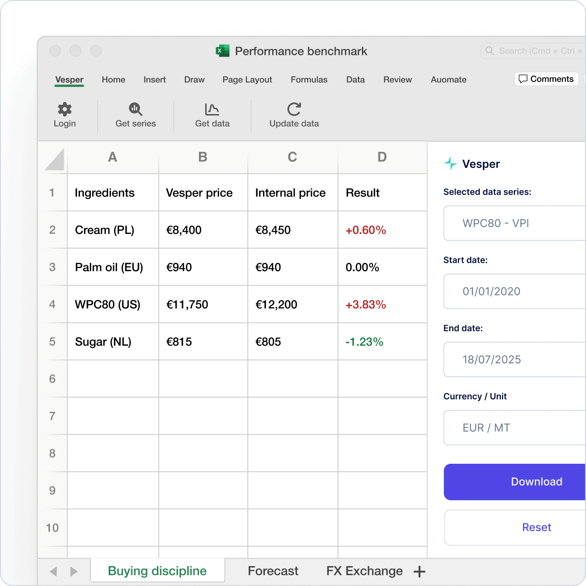 Stop wasting time with manual data entry. Vesper for Excel brings live commodity intelligence directly into your spreadsheets.