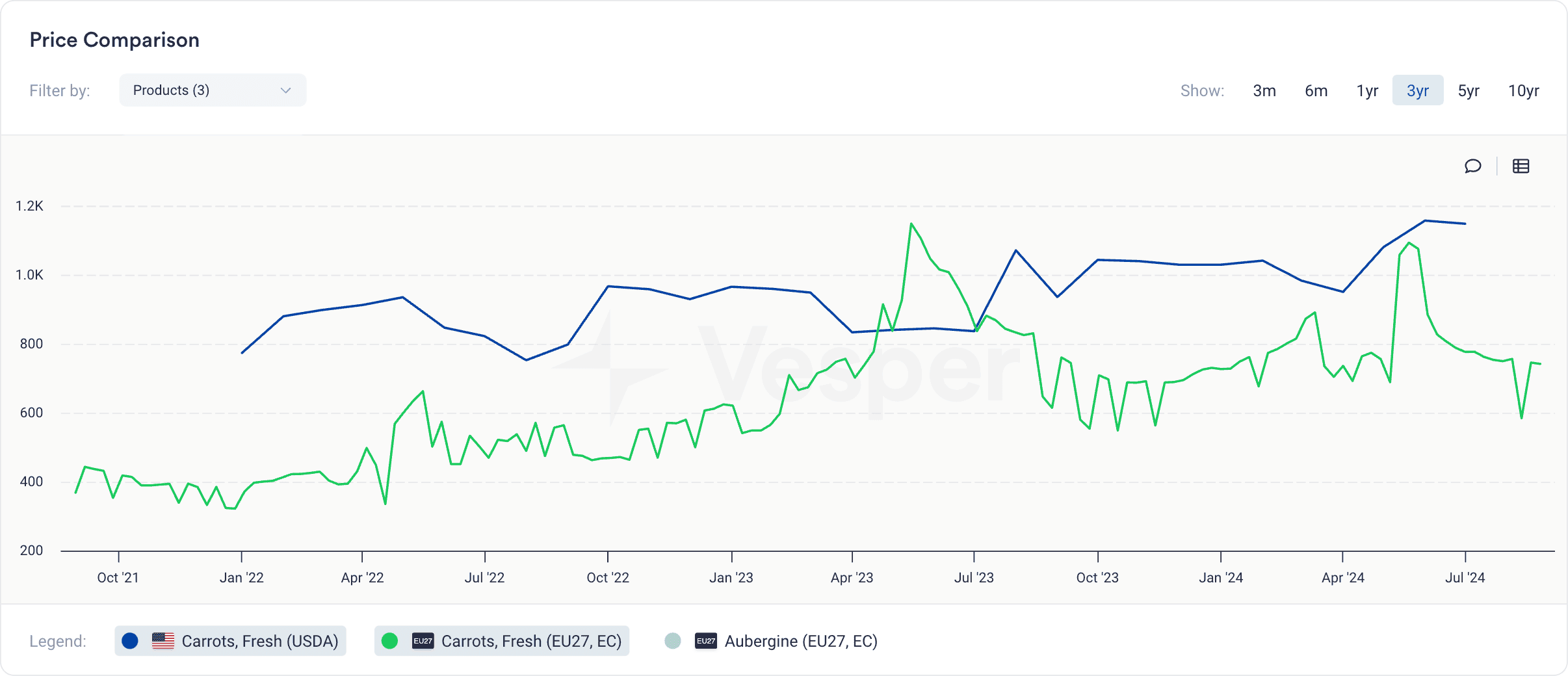 Carrots are a commonly traded vegetable, with notable price variations between regions. For example, Vesper data shows that fresh carrots in the United States are generally priced higher than in Europe due to higher labor costs, transportation expenses, and larger-scale agricultural operations that rely on mechanization, which increases overall production costs.