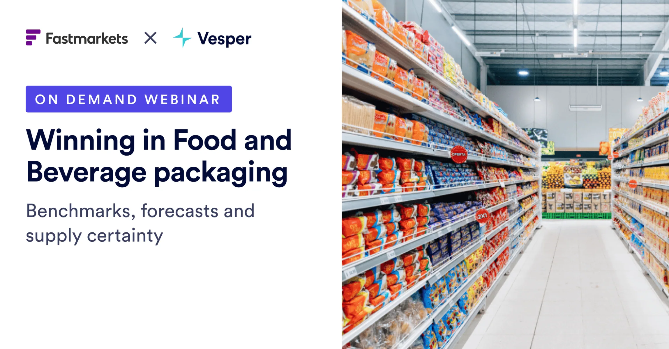 Access the complete on-demand replay of our expert-led session with Fastmarkets, a leading global price reporting agency, and Vesper, the commodity intelligence and forecasting platform. This webinar is designed to help procurement and supply chain teams make smarter decisions in the face of complex and rapidly-evolving packaging markets.
